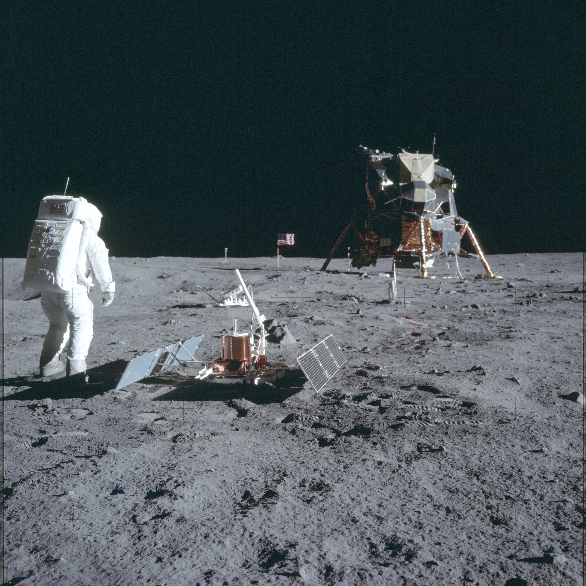 Above: astronaut Armstrong placing a Seismic instrument experiment on the Moon. (file:ISD highres AS11-40-5948) Courtesy: NASA Archives.